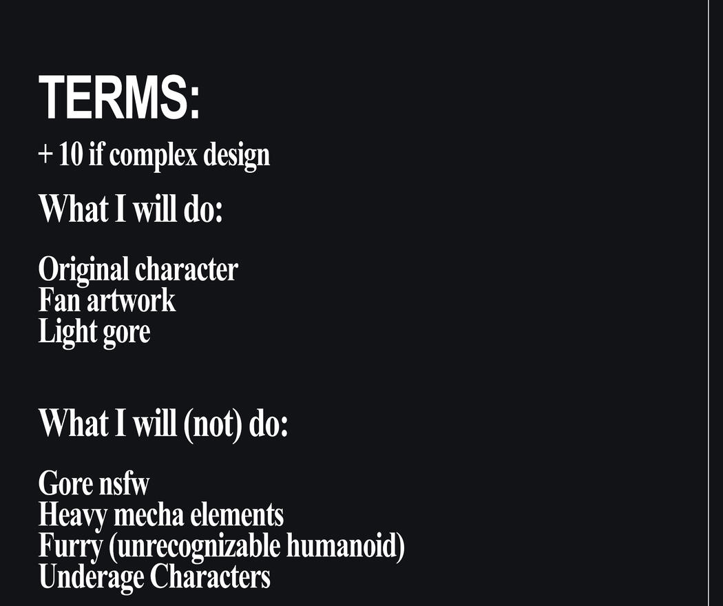 Si il y a une commission, nous échangerons les références/conditions/wip/final par mail.Merci d'avoir lu, n'hésitez pas à poser des questions.