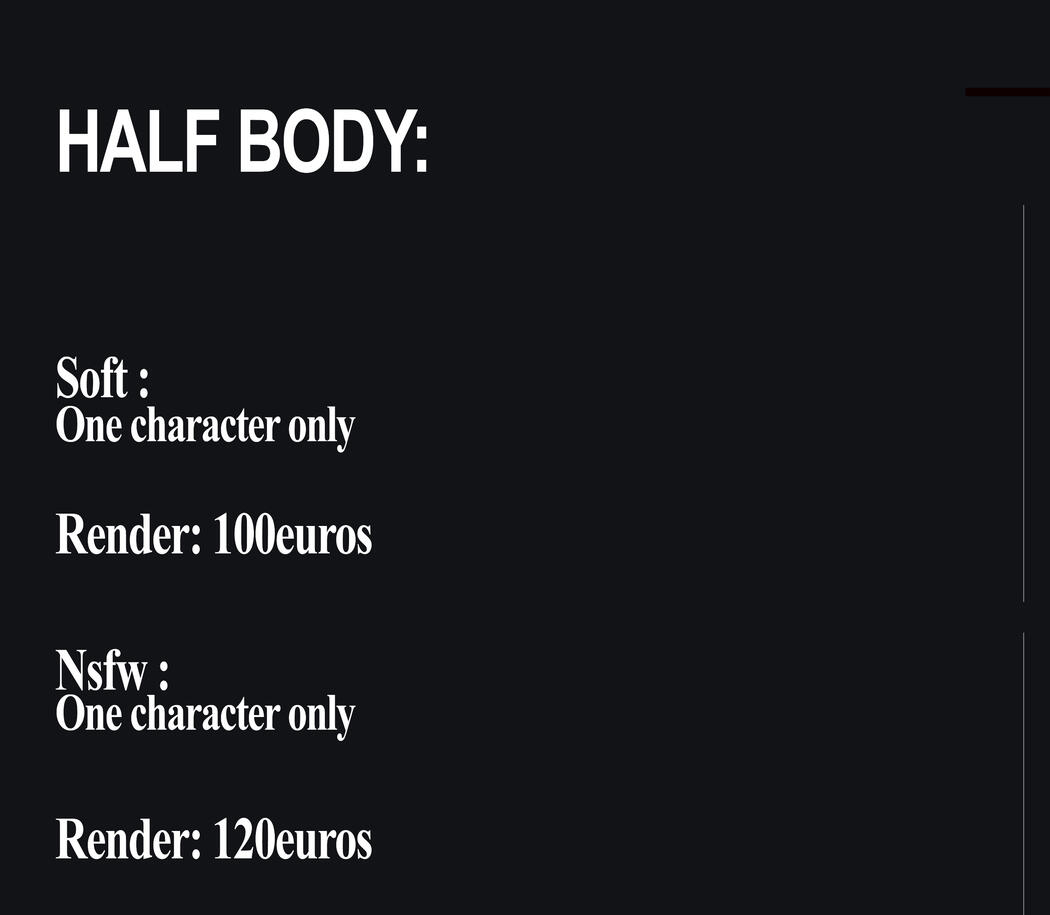 Le reste de mes conditions sont sur VGEN.Je n'accepte les demandes de commission que sur Vgen pour le moment.